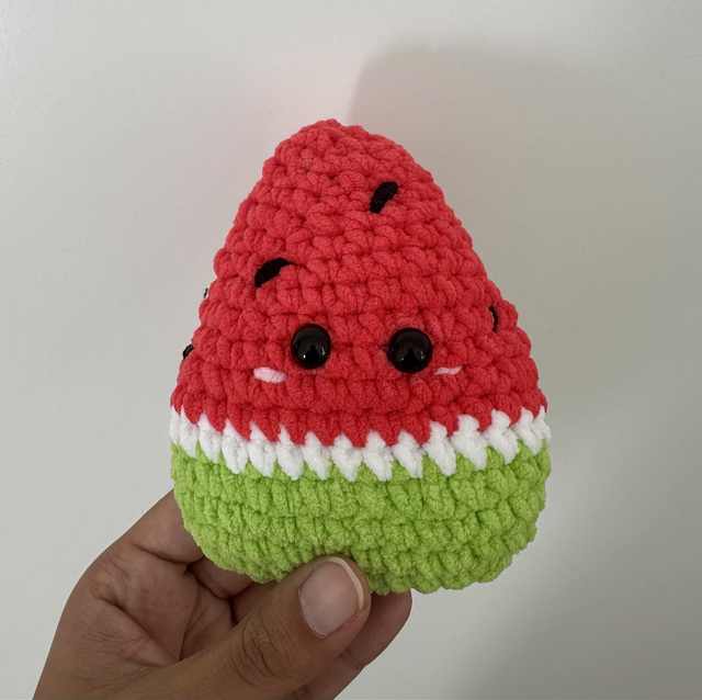Peluche Pastèque crochetée à la main, colorée et toute mignonne. Un accessoire fruité et plein de charme.
